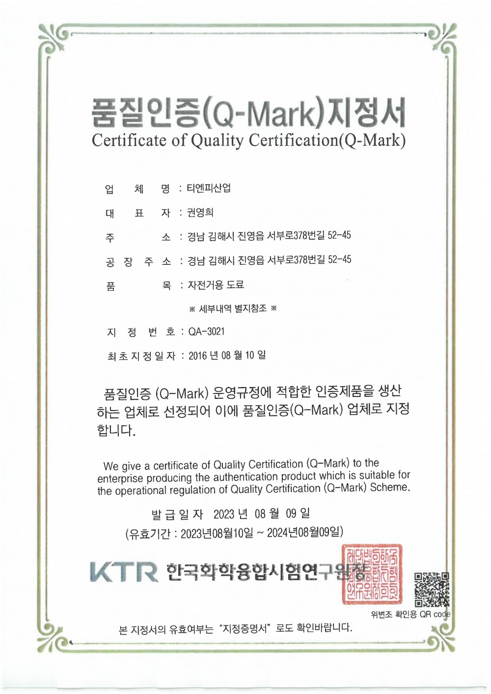 Q-Mark [자전거용 도료] 페이지 정보 작성자 관리자 댓글 댓글 0건 조회Hit 79회 작성일Date 24-02-05 16:38 본문 목록 이전글Q-Mark [콘크리트 에폭시수지계 수조용 방식도료] 24.02.05 다음글Q-Mark [아크릴 에멀젼계 방수 도료] 24.02.05